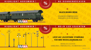 BRAWA bietet zur Black Week bis zum 01.12. eine große Auswahl an Leuchten und verschiedenen Wagenmodellen zu attraktiven Aktionspreisen an. Jetzt zugreifen und hochwertige Modelle für die Anlage sichern. Mehr Informationen